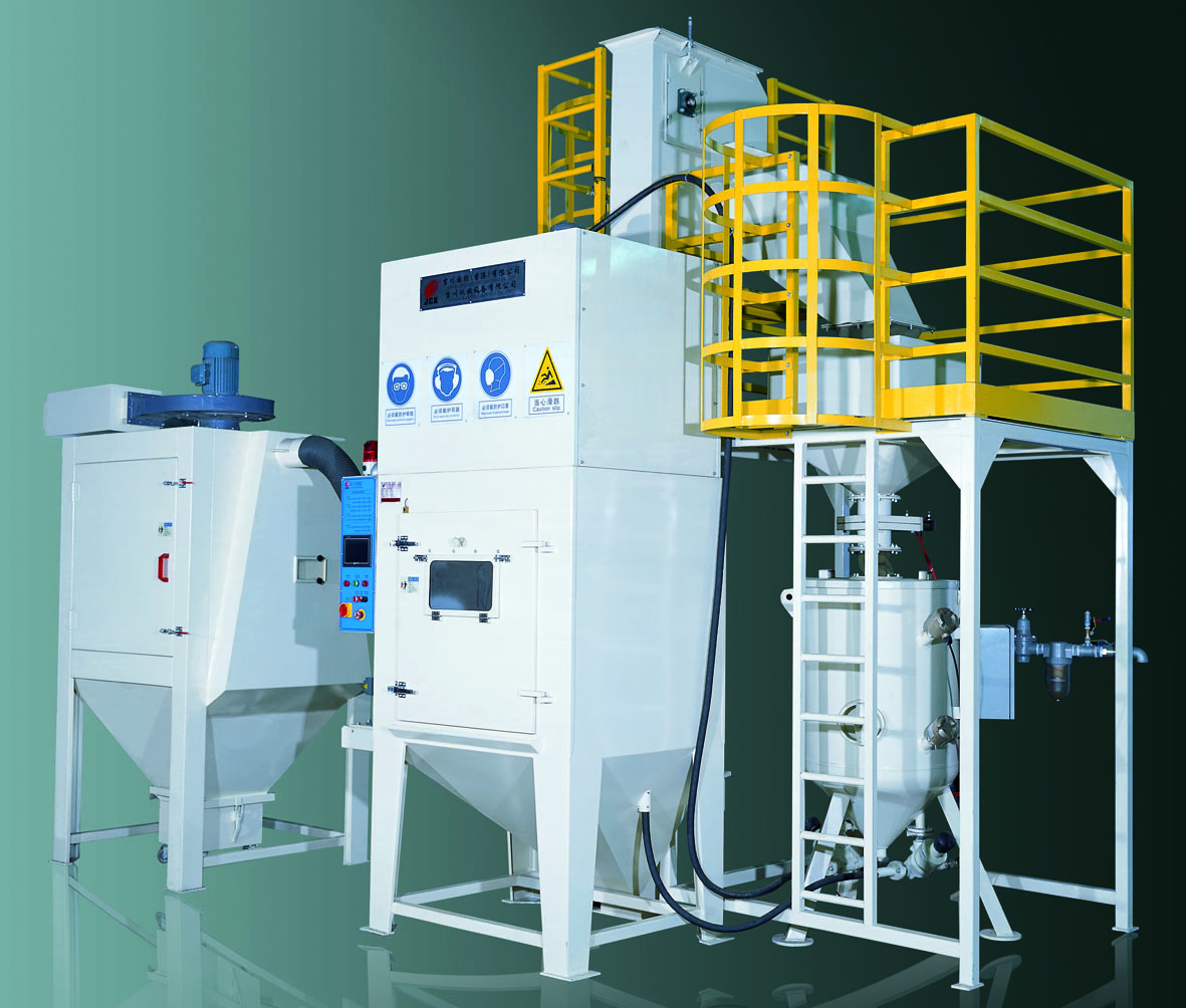 2?丸料和壓縮空氣的混合過(guò)程 丸料和壓縮空氣的三種常見(jiàn)的混合系統(tǒng)是虹吸式系統(tǒng)、重力式系統(tǒng)和直接供料系統(tǒng)。 2.1虹吸式系統(tǒng) 該系統(tǒng)如圖6所示。由于壓縮空氣的速度v2比丸料輸送管道中的速度v1大的多,那么丸料輸送管道中的空氣會(huì)被吸入到壓縮空氣管道中,這就是“虹吸”這個(gè)詞的來(lái)源。由于v1小于v2,那么丸料輸送管道的空氣壓力要高于噴嘴中的壓力。伯努利解釋了這種現(xiàn)象,因此也稱為伯努利定理。如果用p1表示丸料輸送系統(tǒng)中的壓力,用p2表示噴嘴中的壓力,那么我們可以得到: (p1-p2)=1/2.ρA.(v22-v12)?????? ?????????????????????(2)
