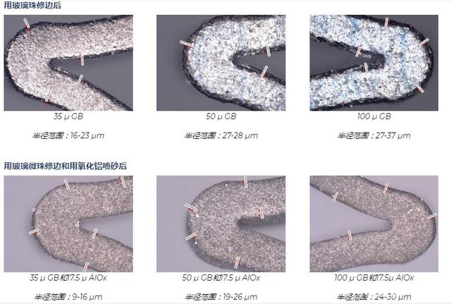 經過吉川公司工藝工程師測試,用氧化鋁砂進行定向的噴砂處理可以去除氧化層,平滑表面缺陷并改善外圍支架的表面質量。支架的受損區域很脆,但基礎材料鎳鈦諾卻具有延展性。氧化鋁噴砂磨料使用去氧化層,并且對韌性基體的侵蝕最小,從而在支架撐桿的整個長度上形成均勻的表面光潔度。 市場最新的支架設計和醫療植入物要求更大的邊緣倒圓角。圓形邊緣降低了被植入物卡住,其他風險的可能性。氧化鋁微噴丸的半徑為5-15 m,但新的幾何尺寸指定為接近25 m。該半徑可以通過三種途徑實現:延長噴砂周期,使用更大尺寸的氧化鋁或完全使用其他磨料。通過測試,我們了解到更長的噴砂周期可以去除更多的團塊,而較大尺寸的氧化鋁會產生過于粗糙而無法拋光的表面。畢竟,氧化鋁顆粒的形狀為塊狀,邊緣稍尖。這給了我們一個可行的選擇:嘗試使用其他類型的磨料。為了克服這一障礙,我們測試了幾種類型的介質,發現用玻璃珠噴砂可以在拐角處形成所需的半徑(最大30 m),而不會除去設備的額外質量。結果是氧化鋁的質量提高了十倍。經過吉川公司工藝工程師的測試事實說明了結果的差異。用氧化鋁噴砂處理過的樣品的半徑僅為8-13 m,而用玻璃珠噴砂處理過的樣品的半徑為24-30 m。 經過吉川公司工藝工程師最終測試事實證明,最好的心臟支架噴砂工藝需要用氧化鋁砂粗噴砂、再用玻璃珠微噴砂是目前最好的一種噴砂工藝方式。 經過粗噴、微噴的產品外徑和內徑轉角處的半徑可以實現,而所需的附加材料去除最少。半徑的大小可以有效地控制,因為它是基于圓形磨料,玻璃珠的大小和速度的。可以控制具有附加半徑的支架區域。通過機械加工表面,有助于保持支架的疲勞壽命。玻璃珠磨料通常用于必須保持嚴格公差的噴丸處理應用中。玻璃珠對支架表面進行噴丸處理,不會去除任何材料或數量可忽略不計的材料。如下所示,玻璃珠的尺寸很重要。玻璃珠的尺寸越大;邊緣越圓。玻璃珠有35 ,50 和100 兩種。讓我們看一下使用每種尺寸的樣本測試的結果。此處顯示的未噴砂的支架表面(500x)邊緣鋒利,并受到制造損壞。半徑范圍僅為3-8 m。為什么用兩種磨料處理比單獨用氧化鋁處理好? 玻璃珠無法消除制造過程中產生的浮渣,回彈和其他損壞;只有氧化鋁可以。氧化鋁不能產生真正的圓形邊緣。但是,它確實可以提供電拋光所需的理想表面光潔度。一個不能替代另一個。通過使用多步驟過程,植入物表面可以使用經過驗證的相同設備獲得兩全其美的效果。在該過程中添加第二種研磨劑聽起來可能需要更多的勞動力,但實際上比其他修邊過程更有效。例如,電拋光可以產生較大的半徑,但它也會從整個零件中去除過多的材料,而不僅僅是角部,從而損害了支架的疲勞壽命。